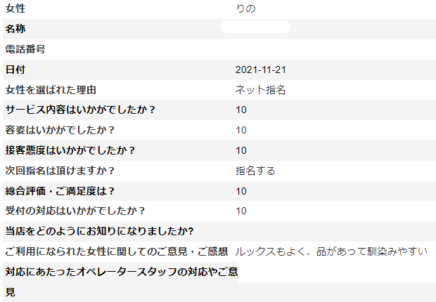 2021年11月29日 りのさんアンケート⑮ 11/29更新♪ O様 いつもご利用ありがとうございます。また、お手数をおかけして貴重なご意見ありがとうございます。当店は、実技講習がないお店なので、次回アンケートいただける際はもう少しどこが良かったか具体的にお教えいただけましたら助かります。※次回はアンケート割でご案内させて頂けますので、受付時に「アンケート割で」とお伝え下さいませ。ただし同じ女性のアンケート割引は適用外となりますm(__)m