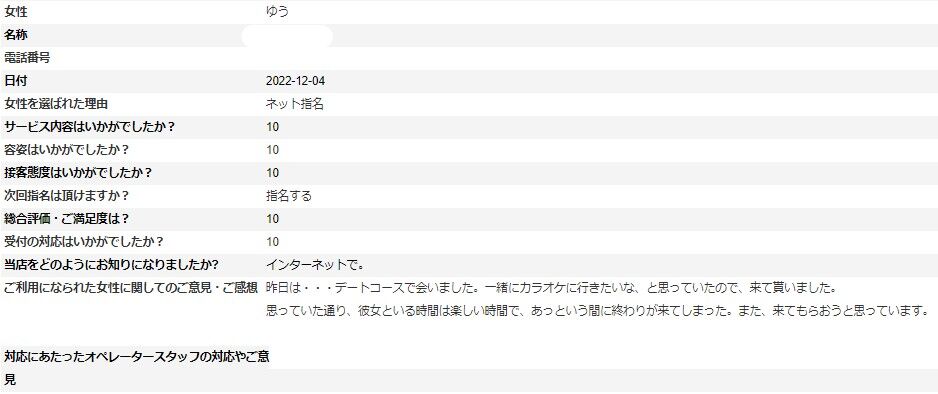 2023年01月28日 ゆうさんアンケート⑪ 1/28更新♪ N様 いつもご利用ありがとうございます。さらに、お手数をおかけして貴重なご意見ありがとうございます。アンケートの掲載が遅くなり申し訳ございません。※次回はアンケート割でご案内させて頂けますので受付時に「アンケート割で」とお伝え下さいませ。ただし同じ女性のアンケート割引は適用外となりますm(__)m