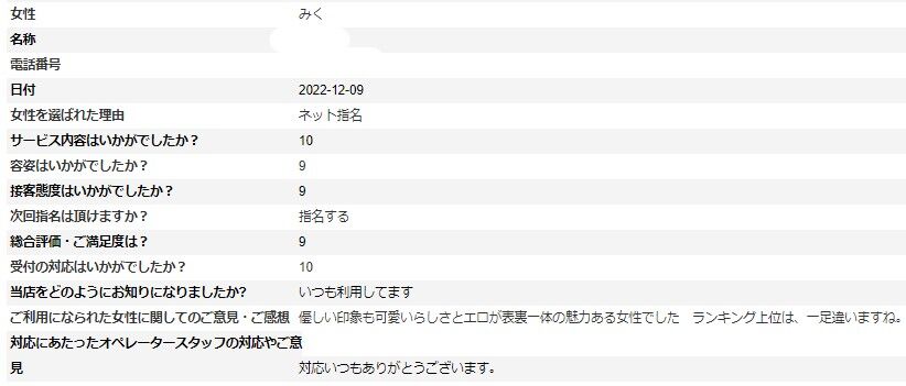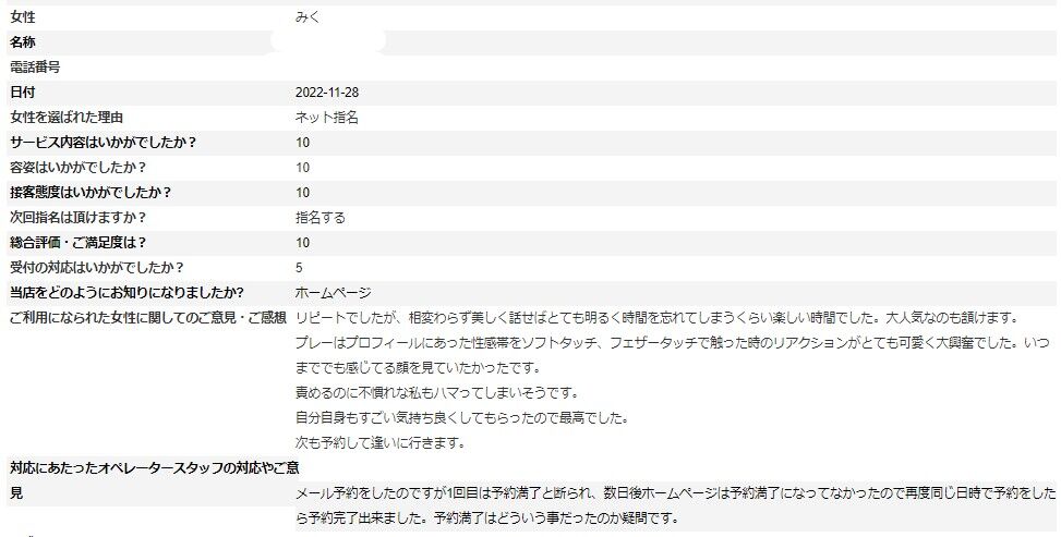 2023年01月28日 みくさんアンケート㉒ 1/28更新♪ k様 いつもご利用ありがとうございます。さらに、お手数をおかけして貴重なご意見ありがとうございます。アンケートの掲載が遅くなり申し訳ございません。※次回はアンケート割でご案内させて頂けますので受付時に「アンケート割で」とお伝え下さいませ。ただし同じ女性のアンケート割引は適用外となりますm(__)m