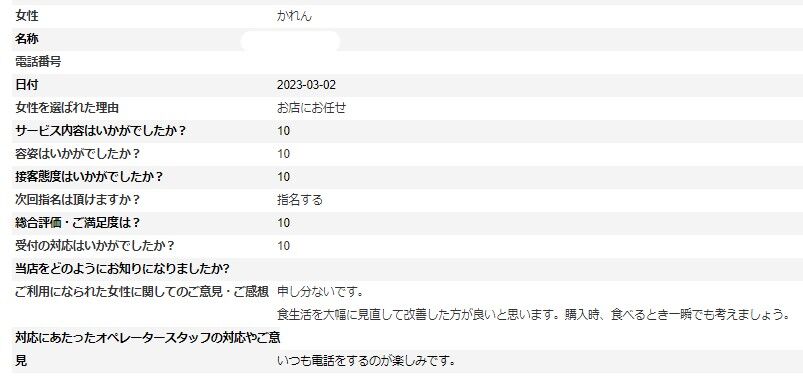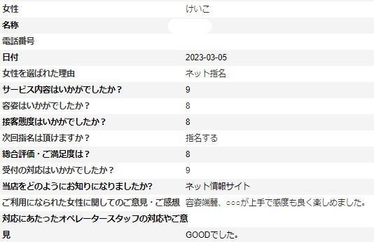 2023年03月25日 けいこさんアンケート③ 3/25更新♪ K様 いつもご利用ありがとうございます。当店は、実技講習がないお店なので、次回アンケートいただける際はもう少しどこが良かったかお教えいただけましたら助かります。※次回はアンケート割でご案内させて頂けますので受付時に「アンケート割で」とお伝え下さいませ。ただし同じ女性のアンケート割引は適用外となりますm(__)mアンケートの掲載が遅くなり申し訳ございません。