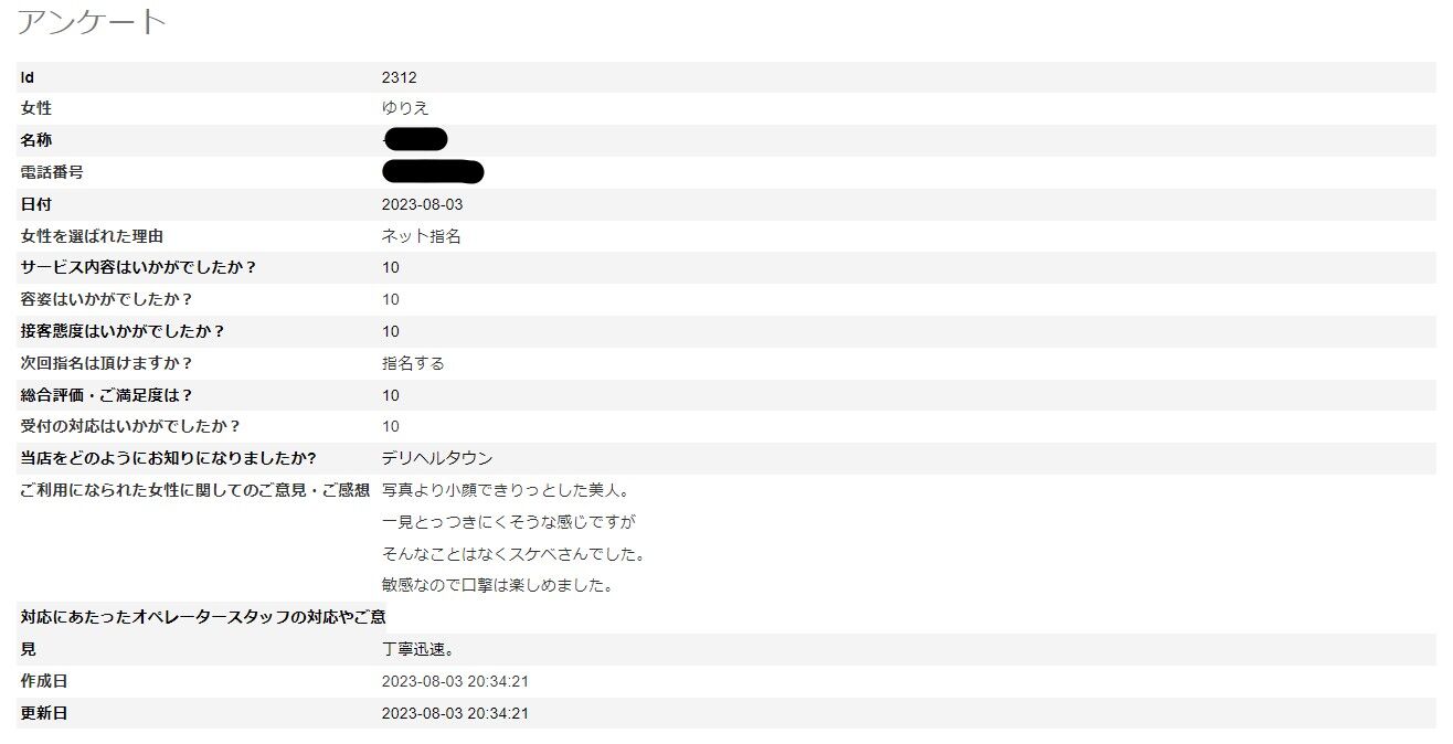 2023年11月20日 ゆりえさん 初アンケート!11/20更新♪ I 様仰る通り、お写真よりも実物の方が、とても良い奥様が他にも多数いらっしゃいます。お好みの女性のタイプは、皆様だいたい決まっているとは思いますが、ご自身のタイプ以外も幅広く、様様な女性にお会いいただけますと幸いでございます。 「ゆりえさん アンケート」カテゴリの最新記事 < 前の記事次の記事 > コメント コメントフォーム 名前 コメント 評価する リセット リセット 顔 星 投稿する 情報を記憶