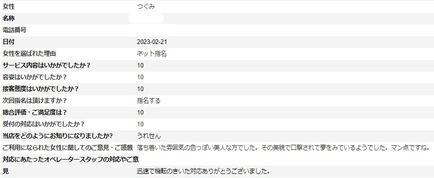 2023年02月21日 つぐみさんアンケート④ 2/21更新♪ S様 いつもご利用ありがとうございます。さらに、お手数をおかけして貴重なご意見ありがとうございます。アンケートの掲載が遅くなり申し訳ございません。※次回はアンケート割でご案内させて頂けますので受付時に「アンケート割で」とお伝え下さいませ。ただし同じ女性のアンケート割引は適用外となりますm(__)m