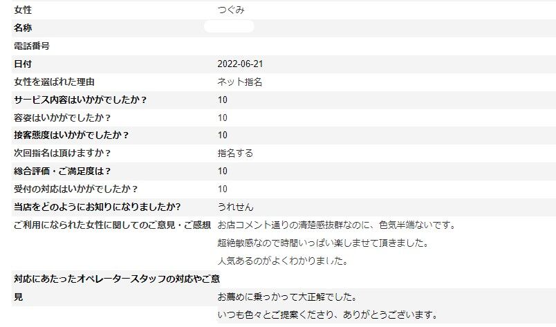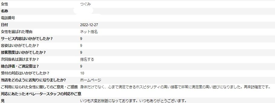 2022年10月08日 つぐみさん アンケート② 10/8更新♪ O様 いつもご利用ありがとうございます。また、お手数をおかけして貴重なご意見ありがとうございます。アンケートの掲載が遅くなり申し訳ございません。※次回はアンケート割でご案内させて頂けますので、受付時に「アンケート割で」とお伝え下さいませ。ただし同じ女性のアンケート割引は適用外となりますm(__)m