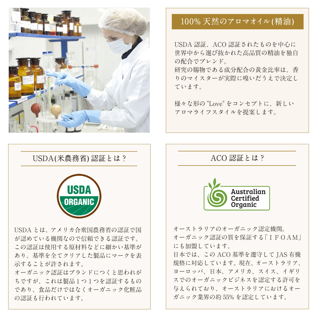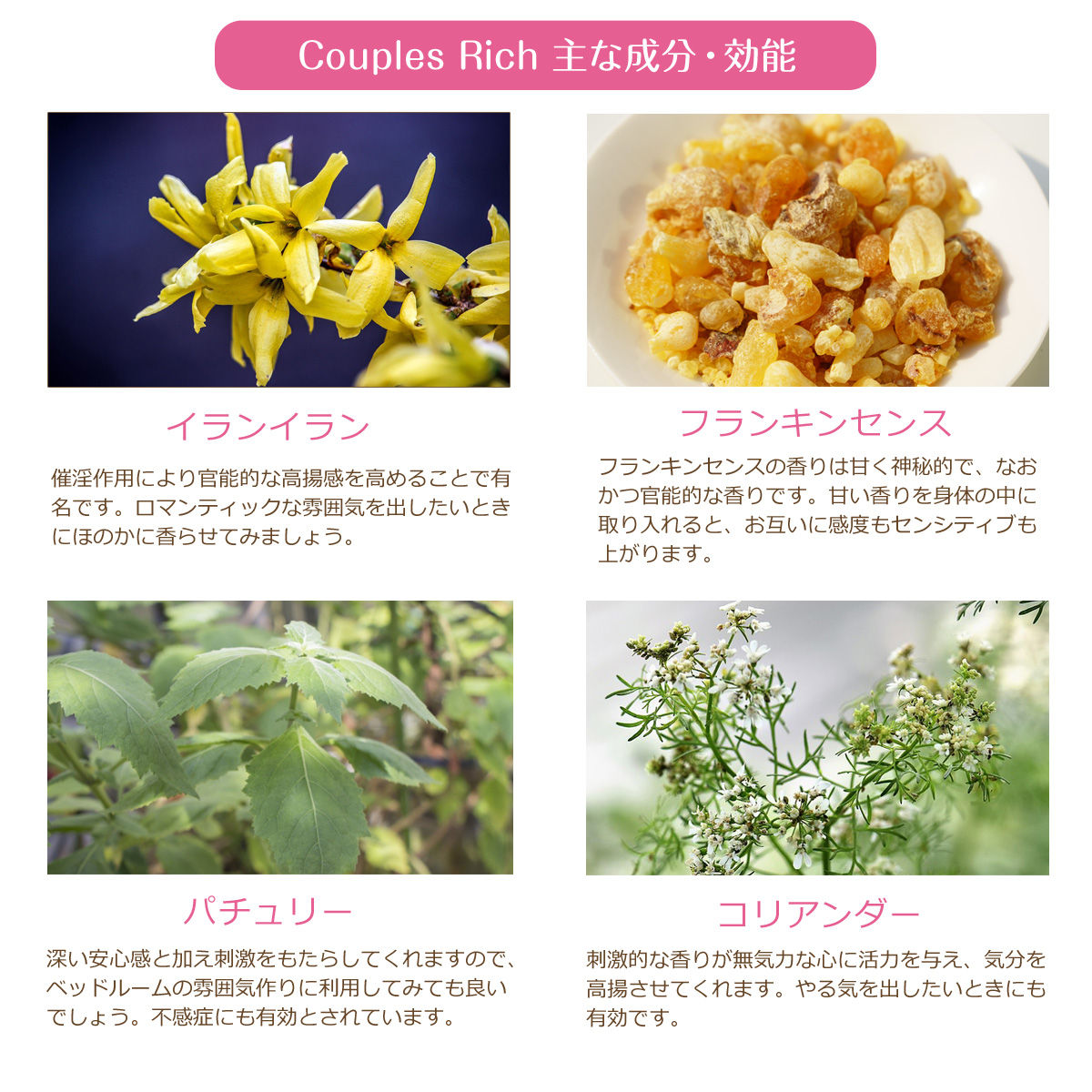「Make Love for couples Rich」は、エキゾチックな甘い香りのイランイランやウッディでスパイシーなフランキンセンスなど六種類の精油を黄金比率でブレンド。