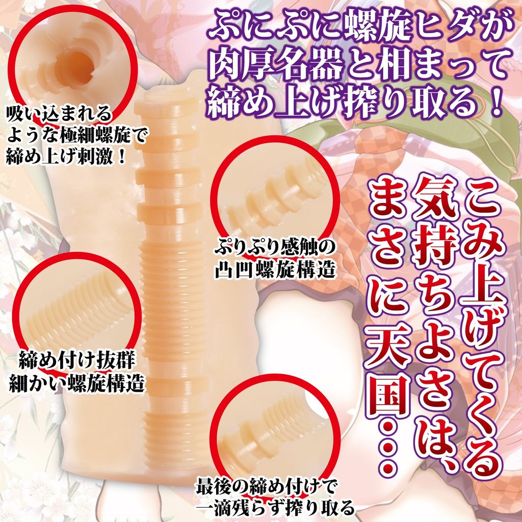 貫通型でぷりぷり、ふにふにした感触の螺旋ヒダの締め付けと刺激により、最後の一滴まで残さず搾り取ります。