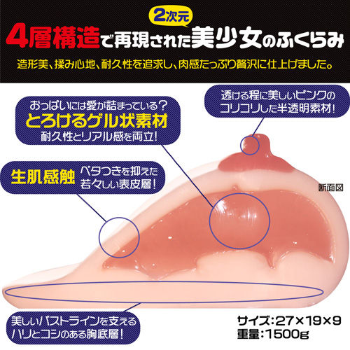 透けるほど美しいピンクのコリコリとした乳首、ベタつきを抑えた生肌感触の乳房層、リアルを再現するとろけるゲル状素材を内部層に採用し、美しいバストラインを支えるハリとコシのある胸底層の4層構造となっています。