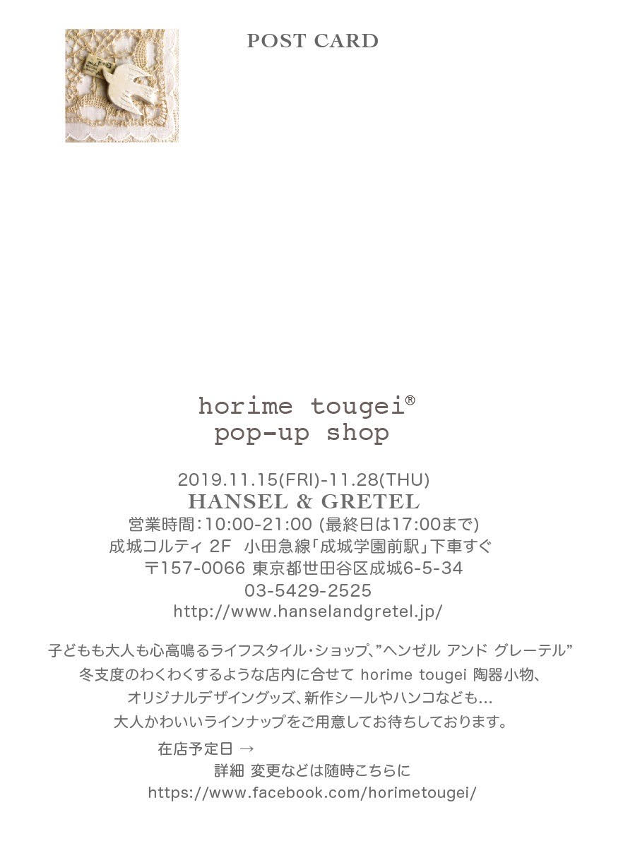 ★11/15(fri)~28(thu)成城学園前HANSEL & GRETEL pop up shop★11/16(sat)17(sun)otegamiフリマ★12月国際フォーラムアートショップ(委託)★12/25~31新宿伊勢丹本館6階「おめでたいもの展」みたいなの ★1月からのhorime tougei教室のおしらせあり、11月中旬くらいに詳細お知らせします。