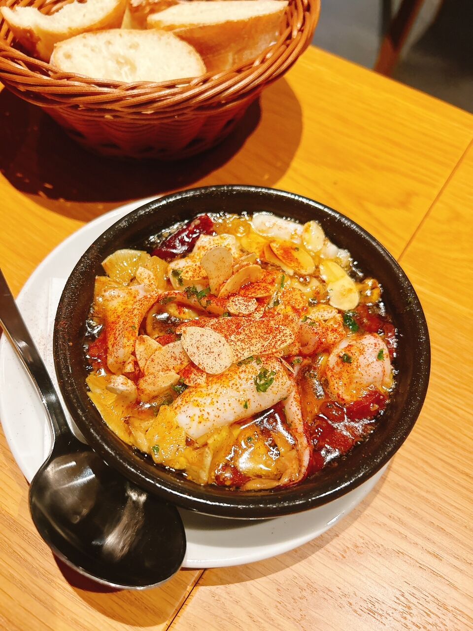ヤリイカとたもぎたけのアヒージョはピリ辛の中にも