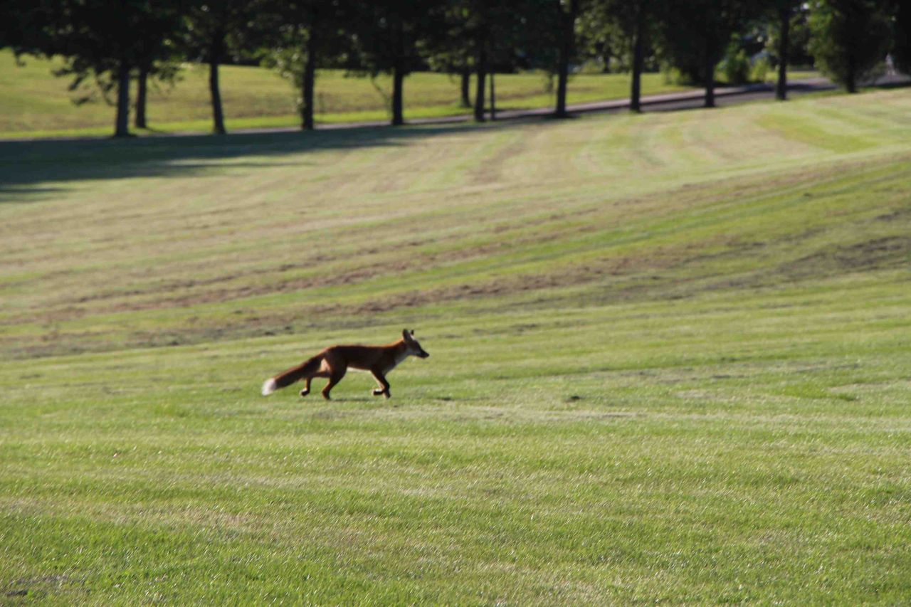 公園内にキタキツネが出没して、小さい子どもをおぶったお母さんに追いかけられていました。