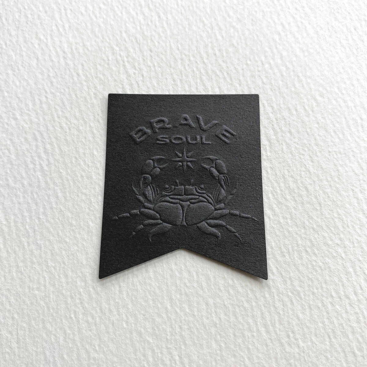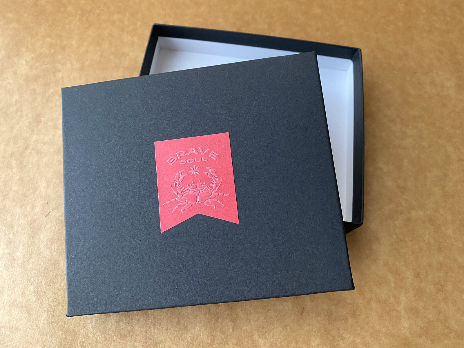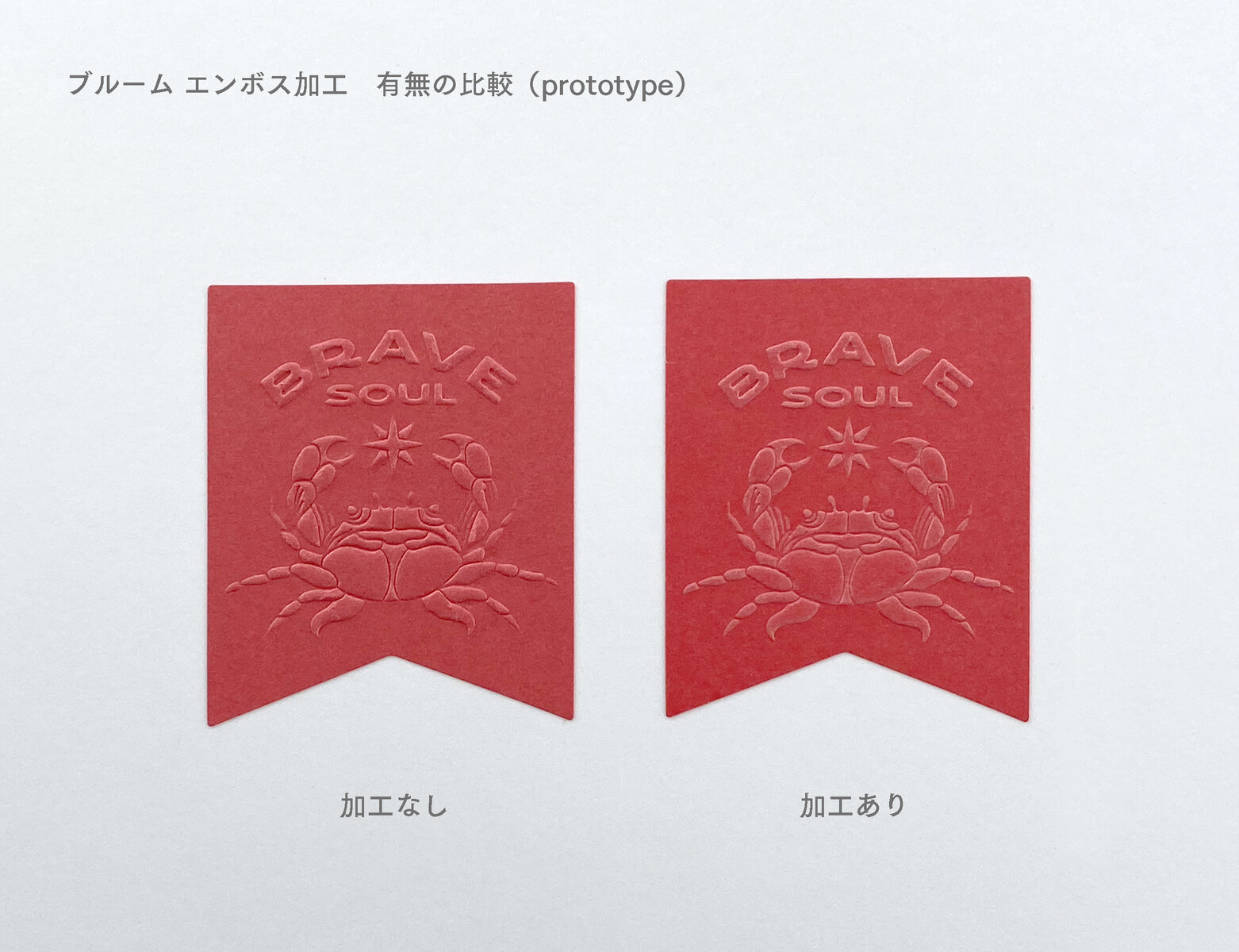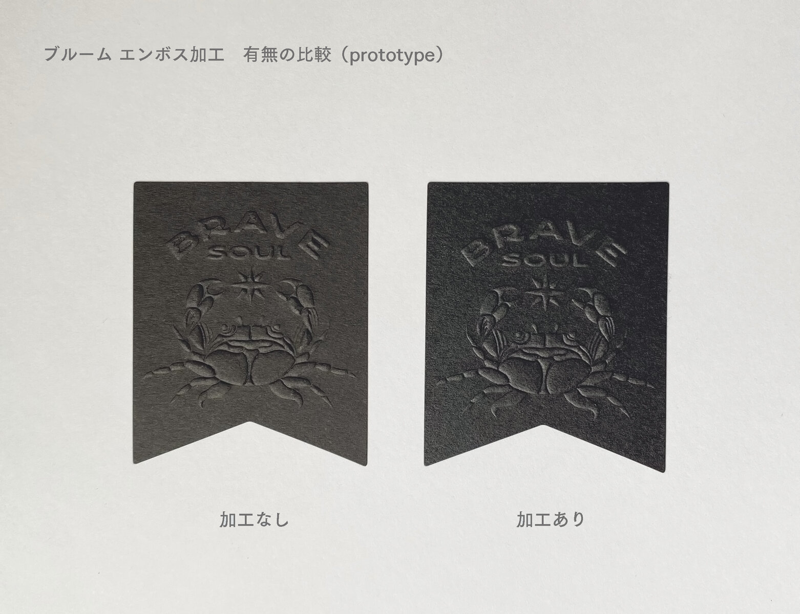 通常業務の間を見て、試作を重ねユニークな仕様にたどり着きました。エンボス加工した部分がほわっと白く色づくことで、デザインシルエットが強調されて独特なエンボス加工に仕上がります。