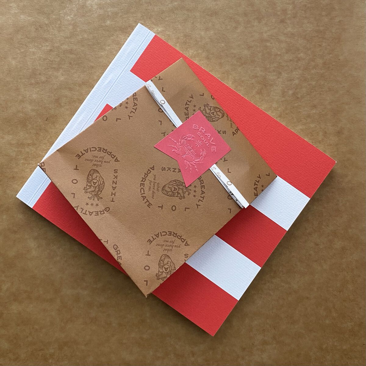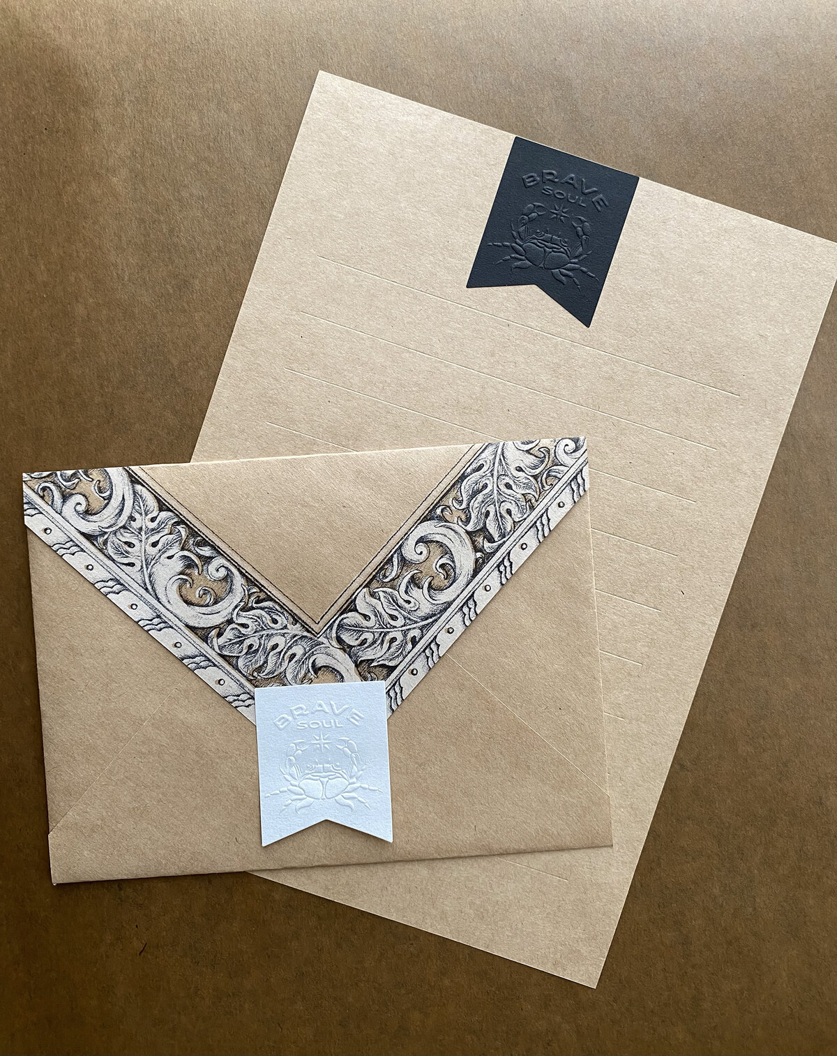 鉄筆で筋入れして便箋を作ってみました。ワンポイント使いはシールならではの使用方法だなと思います。クラフト紙の素敵な封筒は以前デザフェスで購入したPico Glimさんの作品。色付きの紙は白いシールがとても映えます。