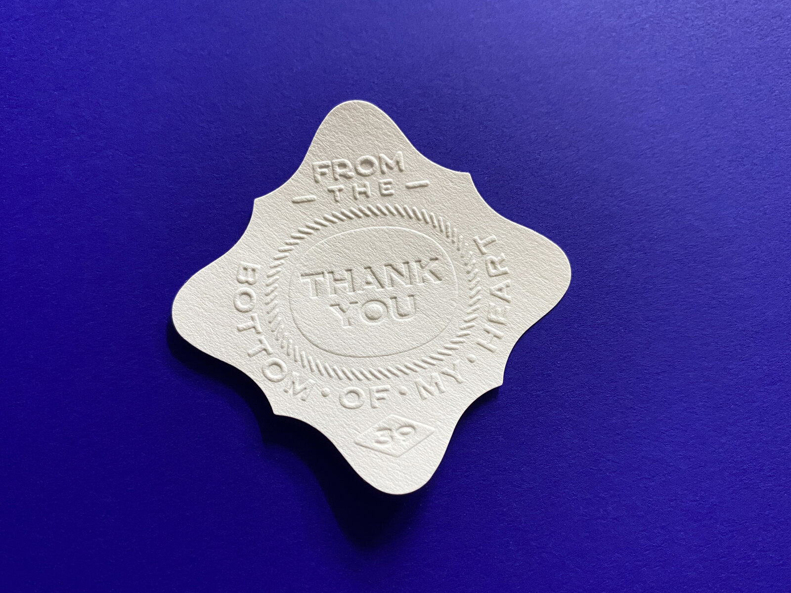第1回エンボス加工シール製造キャンペーンは、「デボス加工の紙をエンボス加工してみよう」という社員の一アイデアから始まりました。一見、パルプ100%に見えますが樹脂が含まれていることで凹凸への変形にも馴染みがよい。デボス用でありながらエンボスでも力を発揮する凄紙「WATERMARK」と出会えたことで遠慮なく圧をかけることができました。