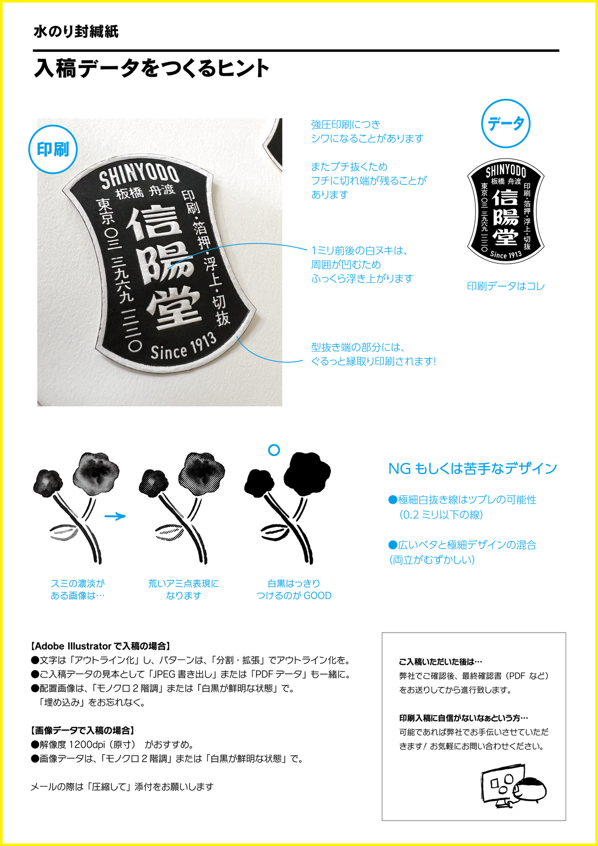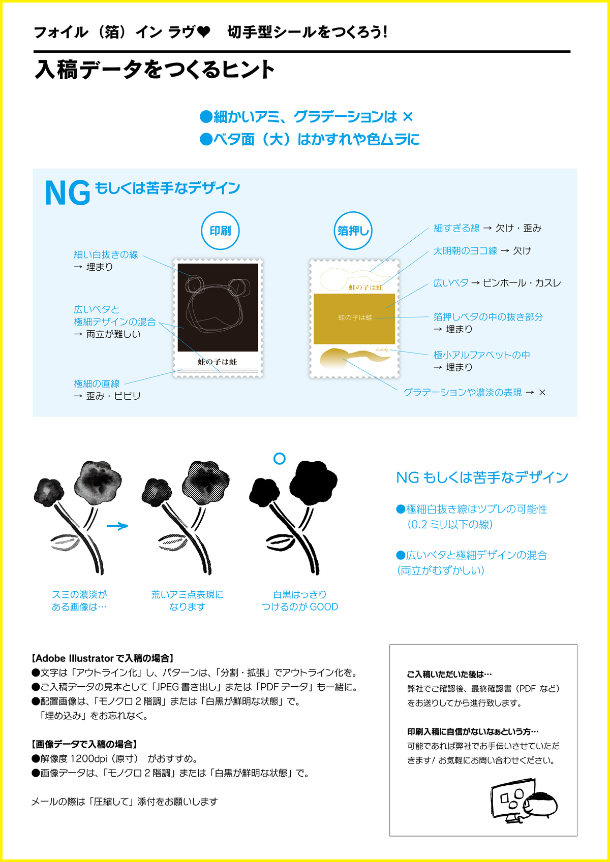 金属製の凸版を紙に押し付けて印刷する方式です。味わい深い印刷面になりますが反面、微細な表現が苦手なのです。「カスレ」などもひとつの味わいとして考えていただければと思います。そんな凸版のためのデータをつくるコツを下記にまとめてみました。画像をクリックすると、より大きな画像に切り替わります。ご参考いただけばと思います。