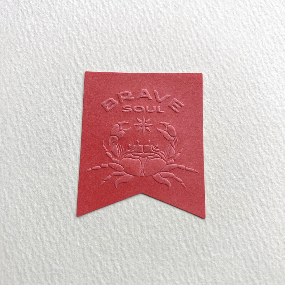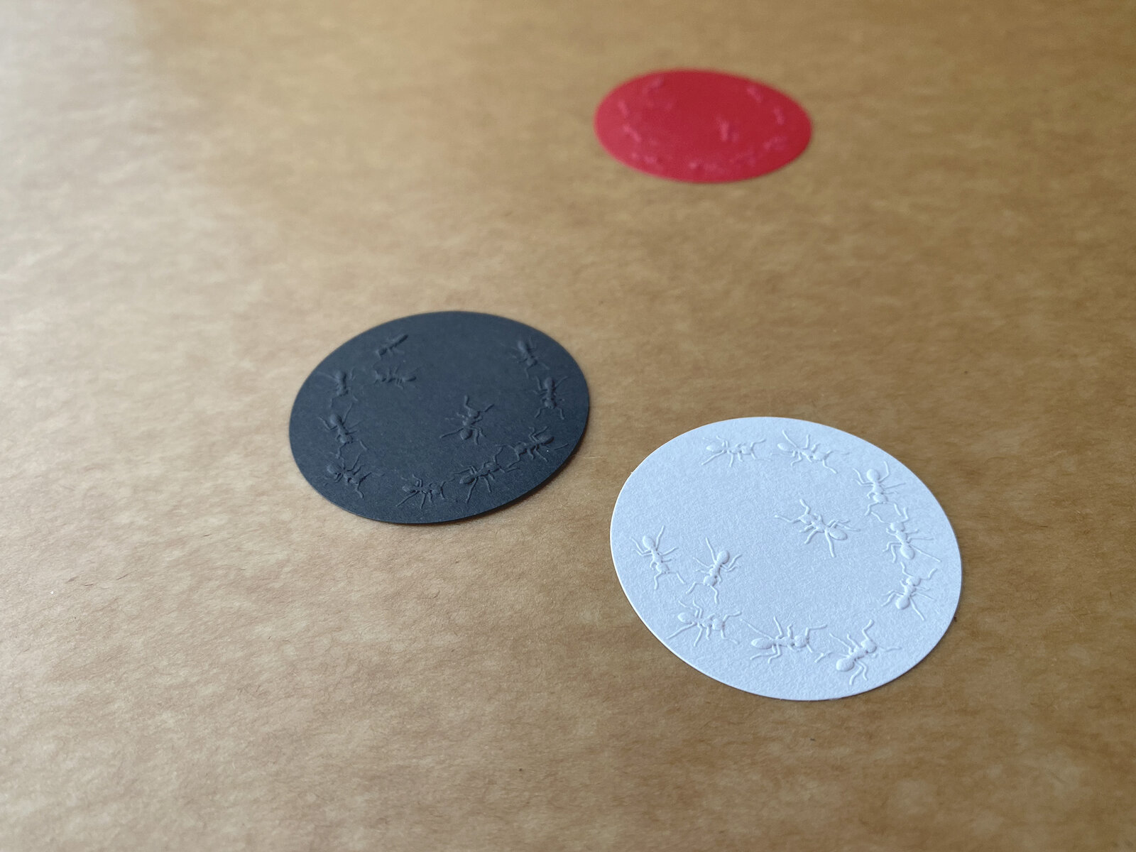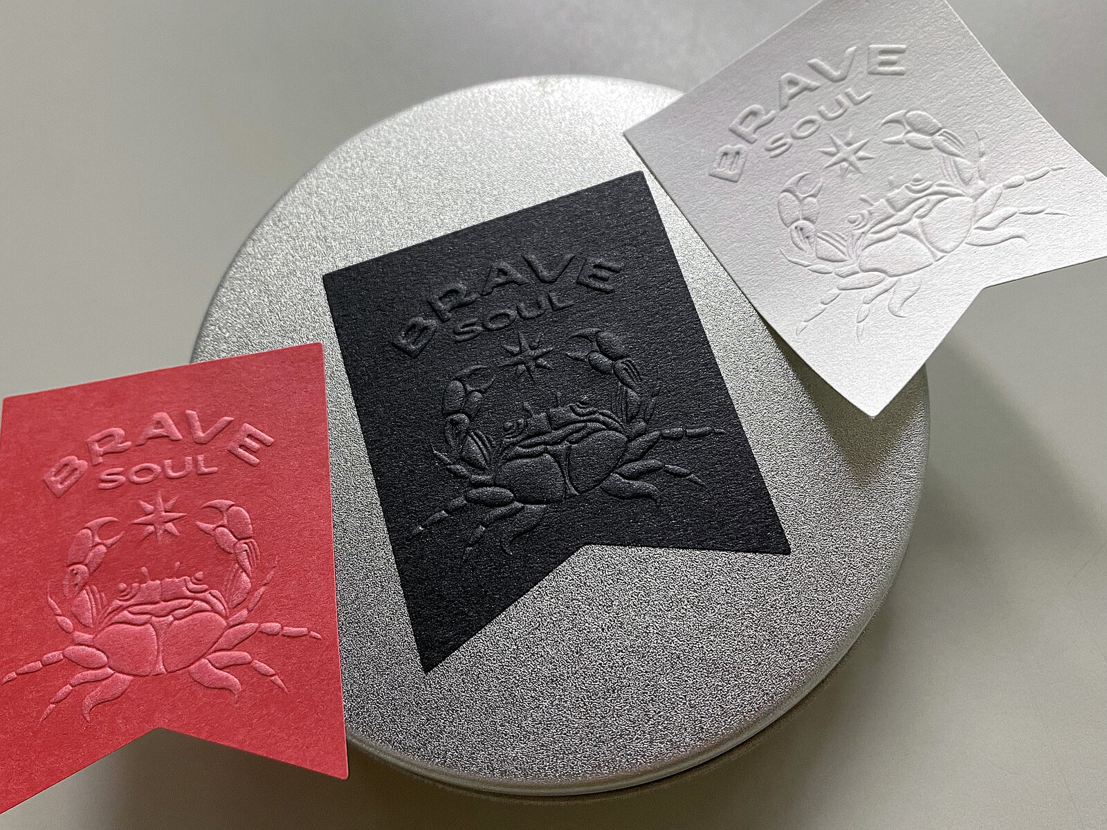 金属版を使用して ①印刷 ②箔押し ③型抜き の順に加工します。オフセット印刷のような高精度な印刷面というより、カスレ・揺らぎ感・凹み感のある活版印刷のような味わいのある印刷面になります。