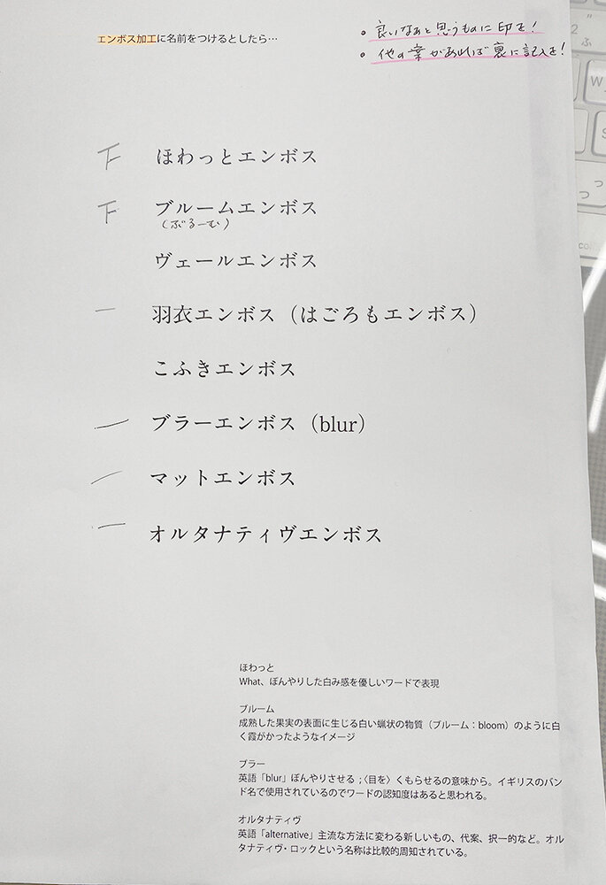 緊急でネーミング候補をいくつか提案し社内の意見を募ることに… ここにその時のメモがあります。2つの名前が拮抗した結果、今後も手法として展開しつづけていければという気持ちを込めて、真面目にかっこいいネーミング「ブルーム エンボス」と名付けました。