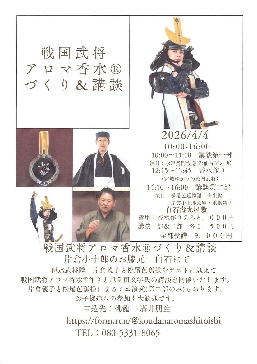 内容:伊達武将隊をお迎えして戦国武将アロマ香水作りをしま