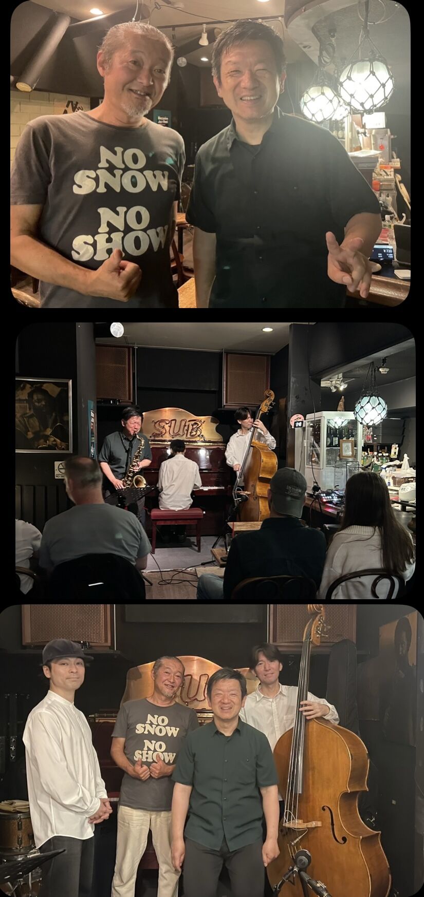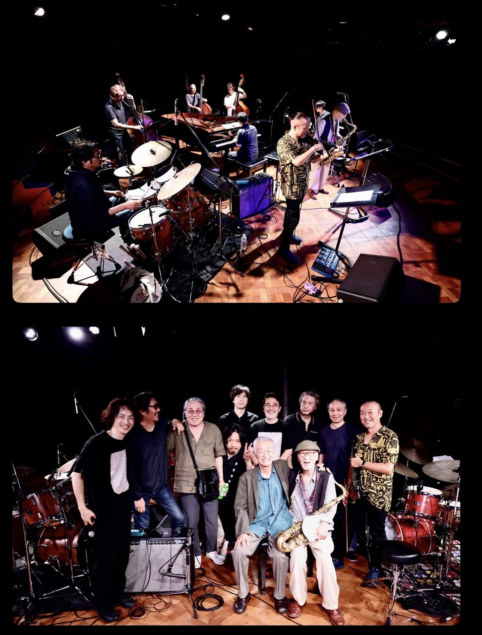 「即興演奏家」がこれだけ一堂に会せば、何を決めても決めなくても、そこに居て何か「会話」をするだけで稀有なアンサンブルが成り立ってしまう。それの最たる例でした。須川崇志 (B) 峰厚介 (TS)渋谷毅 (P)遠藤ふみ (P)大友良英 (G)杉本智和 (B)菊地雅晃 (B)本田珠也 (drums)村上寛 (drums)定村史朗 (violin)(遠藤ふみ、杉本智和、村上寛 、各氏が写真に写り込んでいませんが、ちゃんといます。)
