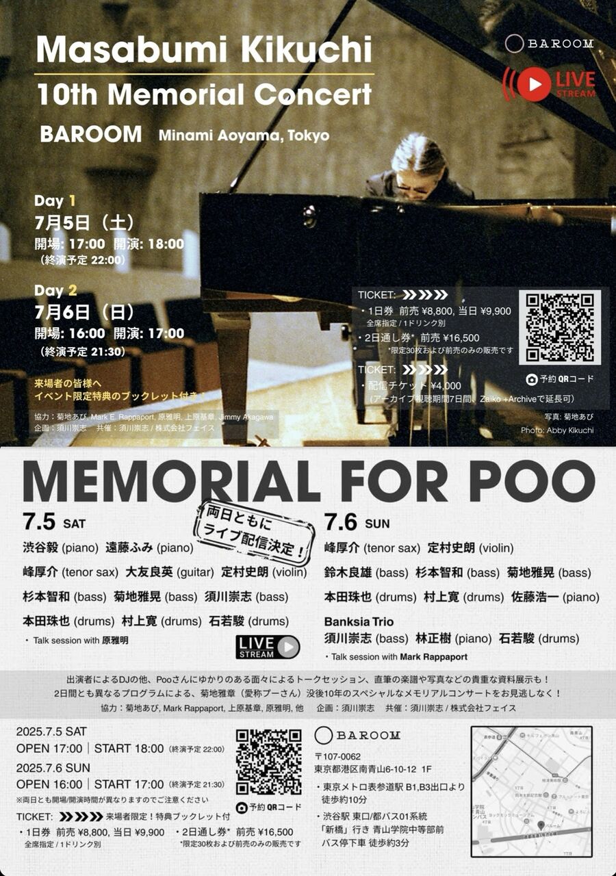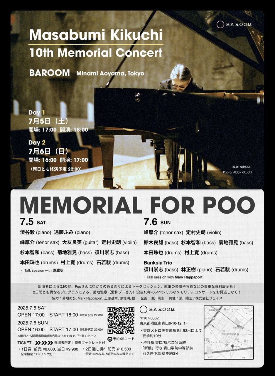 単なるメモリアルコンサートではなく、菊地雅章の残した音楽的そして精神的な遺産を、何らかの形で引き継いでいると自覚している者達が、それを単に掘り起こすのではなく、新たな意志とディレクションを宿らせて「ジャズ」を前に進める事ができた二日間だった。(と思いたい。)と同時にpoo さんが知らぬ間に「メモリアル」される側の存在になっていた事に当惑した。元気な頃の彼ならば、絶対嫌悪したであろう類のイベントだったかも知れないけれど、上記の様なとても良い大義名分を付けて「使わせて」もらったよ poo さん。「for good music」 poo さんならきっと、ここで黙ってニンマリとする。