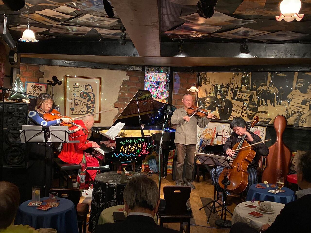 Villege Vanguard の様な天井低めのウーファー形状のエアジンで、ノーマイク(完全生)の弦楽ユニットがどうサウンドするかちょっと不安もあったが、5人の音がステージ上でも自然に聞こえてきてアコースティックの大切さを改めて感じた。完全即興を主としつつも、ギルエバンスの Eleven や You Stepped Out Of A Dream, Yesterdays, といったスタンダードも取り入れてフリーだけでは無い「括りのある」インプロもかすみ流に演奏しました。5人それぞれの個が融合と離散を繰り返し、聴いたことのない音世界が垣間見えたと自負しています。