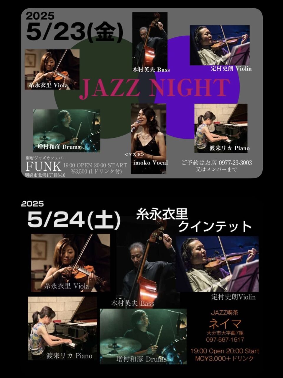 5/23 (金) は別府の老舗バー「ファンク」に糸永衣里クインテットで出演。ゲストにボーカルの Imoko さんをお迎えしてお送りします。