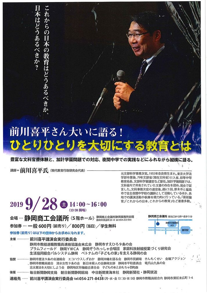 前川喜平さんの講演会が添付しましたチラシに記載された日程で開催されます。前川さんの講演については、7月14日の諏訪部弁護士のブログでも紹介をしています。私も諏訪部弁護士と同じ機会に前川さんの講演を聞かせていただきました。今の日本の教育にどのような危険性を感じているのか、まさに現場で直接見られてきた前川喜平さんだからこそ、説得的にお話をしてくれると思います。またユーモアを交えて話される内容には、
