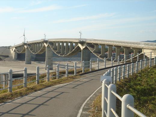 菊川の河口にかかる、長さ232m、幅3mの歩行者・自転車専用の橋で、太平洋岸自転車道の一部です。日本最長、世界初の4径間連続上路式PC吊床版橋という、とても珍しい構造をしています。人気のあるウォーキングコース、サイクルロードで、夕陽の撮影ポイントとしても有名です。