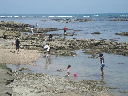 人工の潮だまりは、岩の間にいる魚・エビ・カニ・ヤドカリなどの海の生き物を、干潮時にタモを使って捕まえることが出来るので人気です。