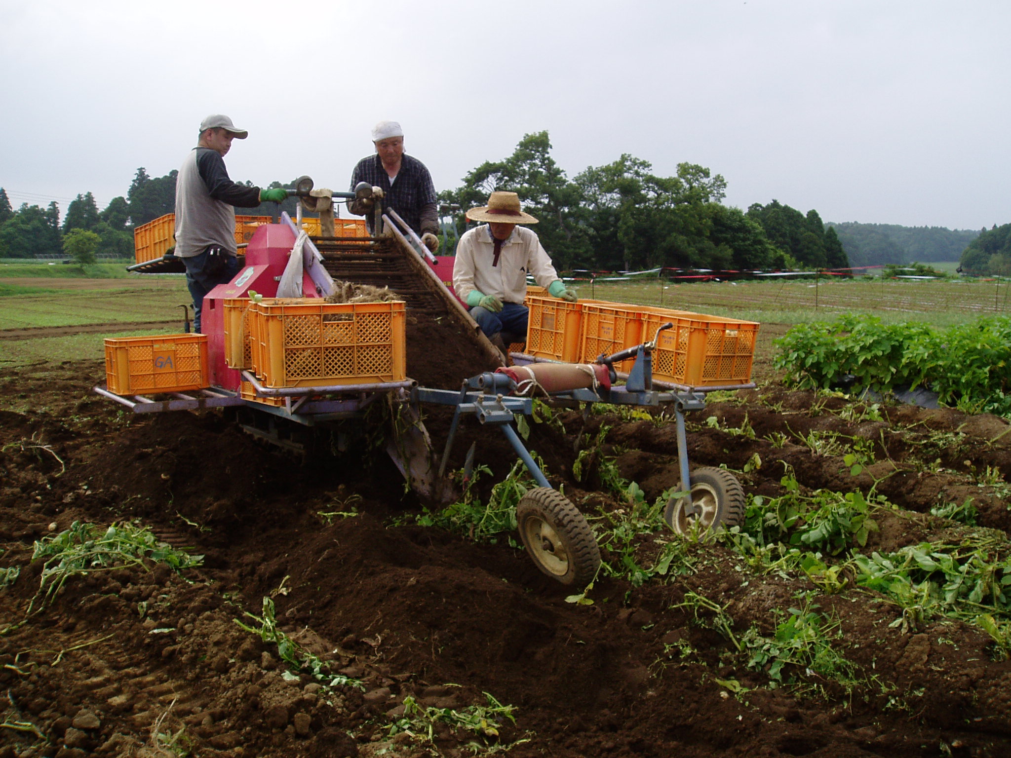 しかし、有機農業なのにベルトコンベアで流れ作業。なんだか無機質な感じです。この収穫作業の様子を見た人からはそんな感想がよく聞かれます。確かに、自分が操縦しているとはいえ、ドンドコ流れてくるジャガイモを必死に選別して、はぁはぁいいながらなんとかこなしていく様は、チャップリンの映画ではないですが、さながら人が機械に支配されているかのようです。畑の芋にあわせて機械を微妙に調整していき、その速さにあわせて人が動く。この空間では「人間<機械<野菜」という構図が成り立つのでしょうか。
