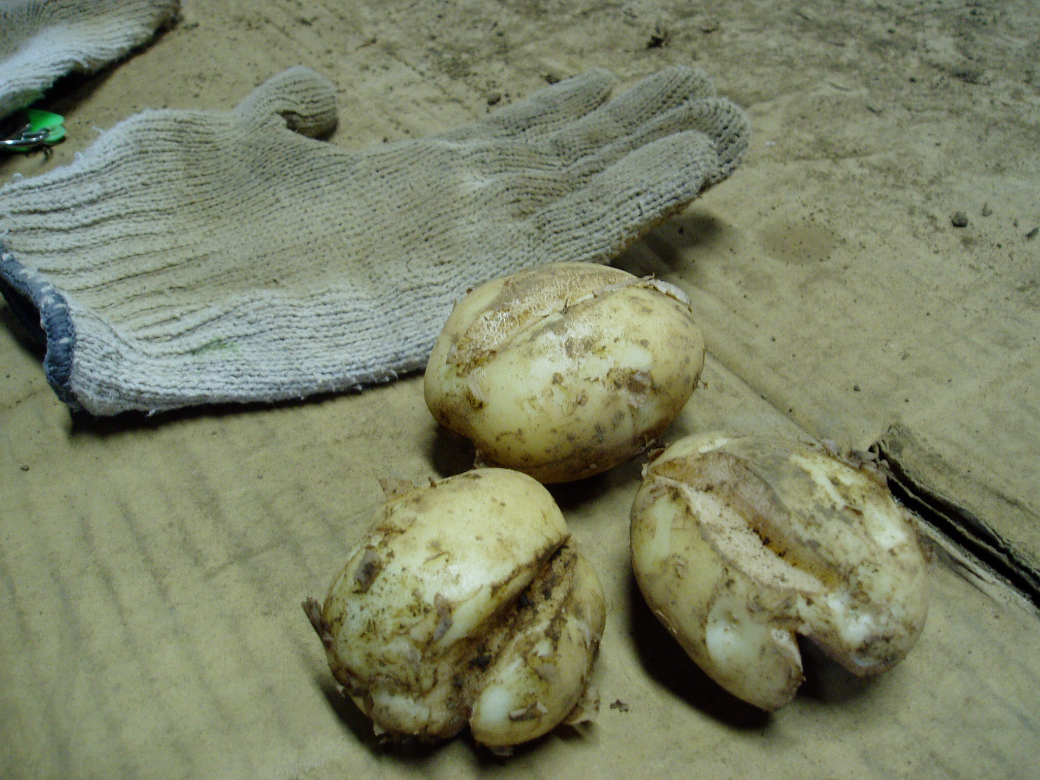 そろそろジャガイモの収穫ということで試しに掘ってみたところ、裂け目のようなものができているものが多かったです。これは寒いところに急に暑くなったりして、実の成長と表皮の成長のバランスが崩れて裂けてしまったのではないかといわれています。この春の天候不順の影響はまだ続いているようです。