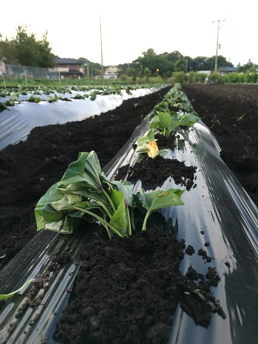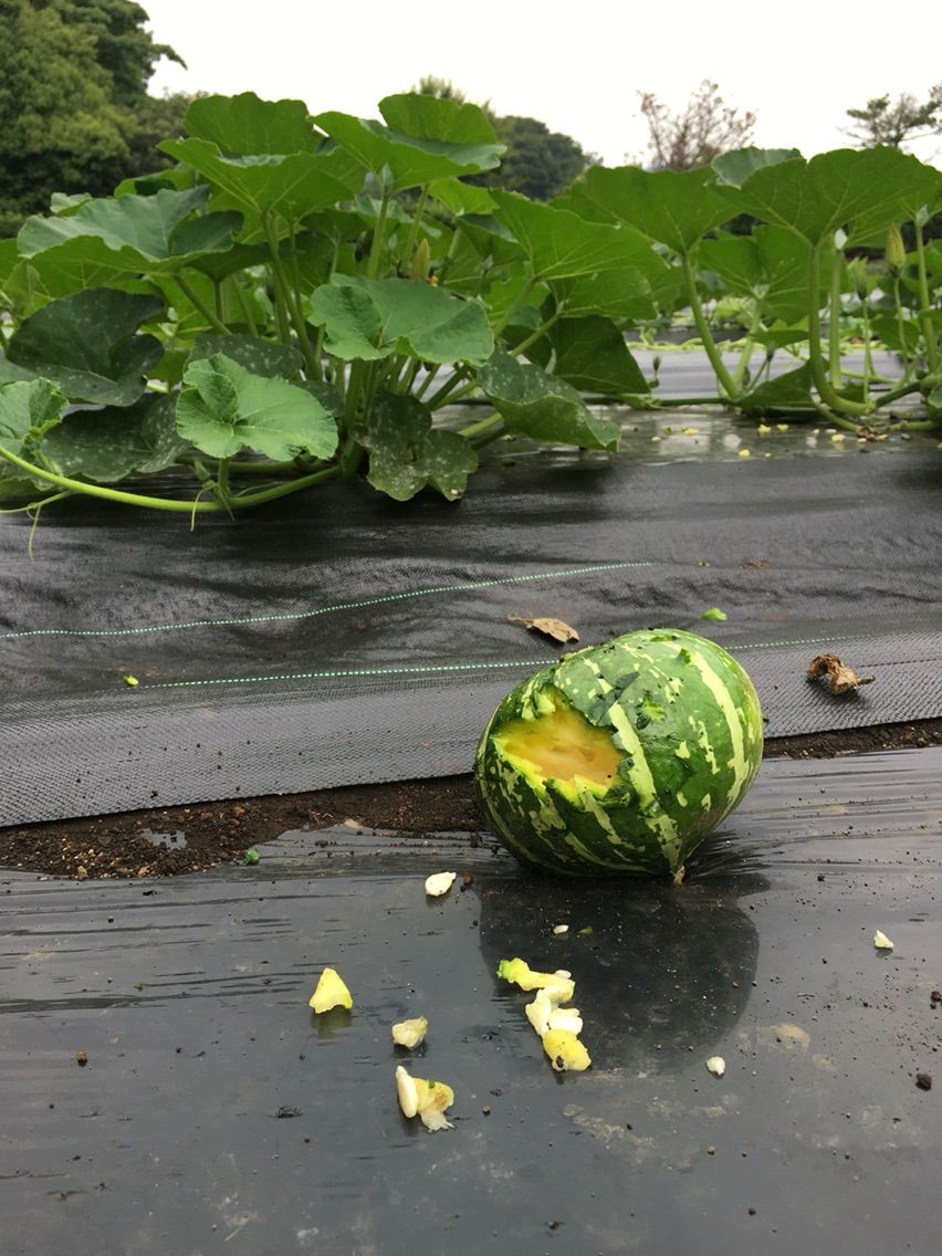 最初は破かれたマルチを見つけて、「また猫のしわざか!」と思ったのですが、視線を畑の奥にやると耳がピンと立ったおうど色の動物が親子で2匹。犬でもないし、ハクビシンやタヌキでもアライグマでもない。あとで調べたらホンドギツネのようでした。
