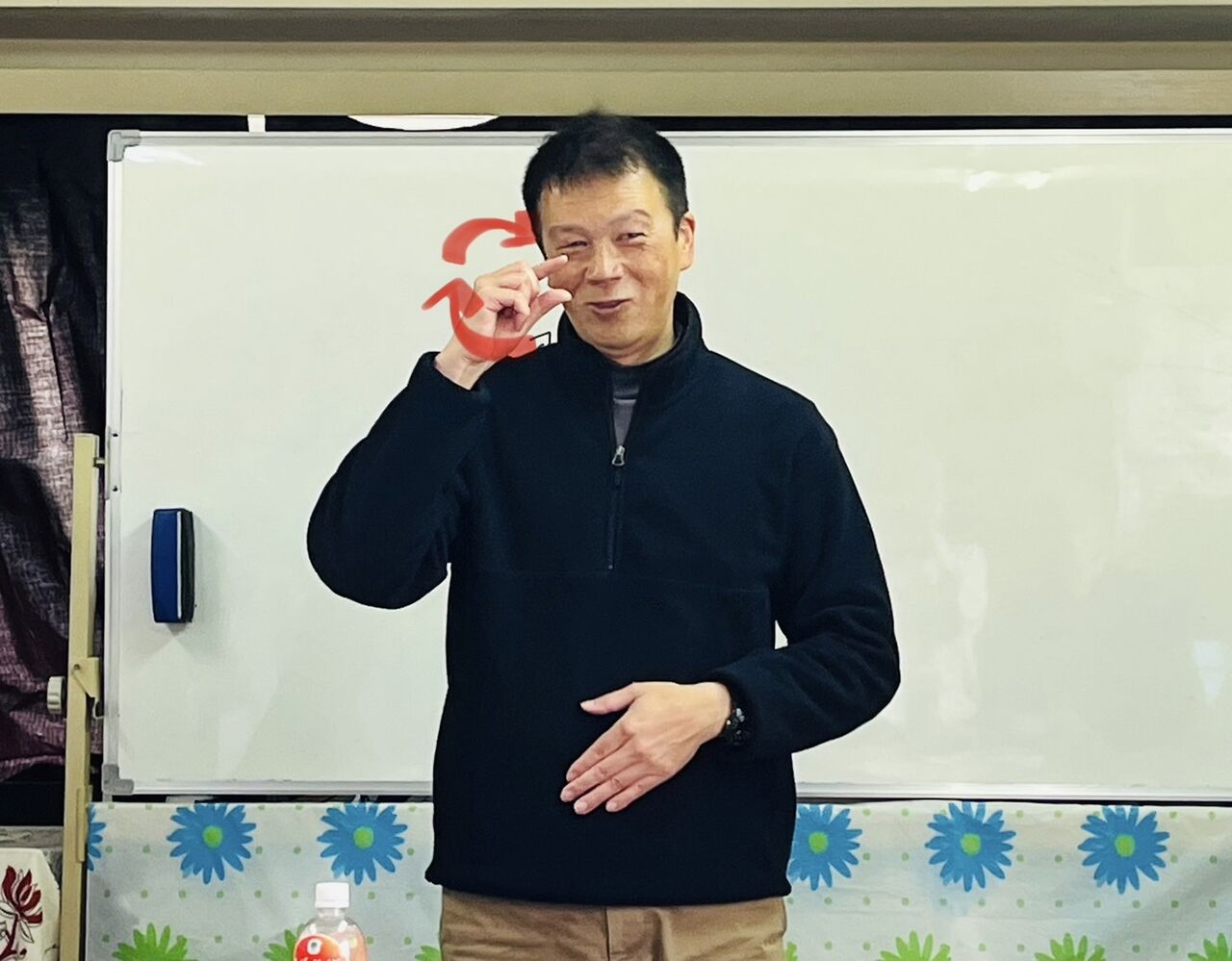 河内講師が持っていたペットボトル飲料のメーカー「サントリー」の手話表現をしました。