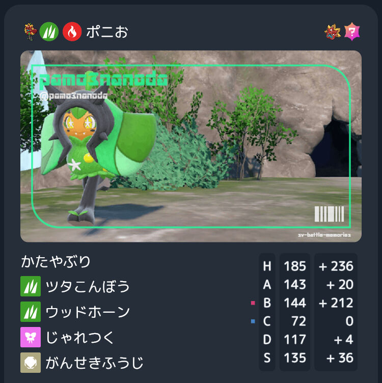 調整意図は、火力が欲しいのでCぶっぱ。Sは準速ラオス抜き抜き。HBはテラスした状態でステロ+特化パオジアンのつらら落とし確定耐え。余りD。