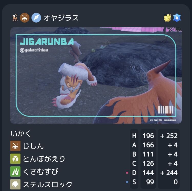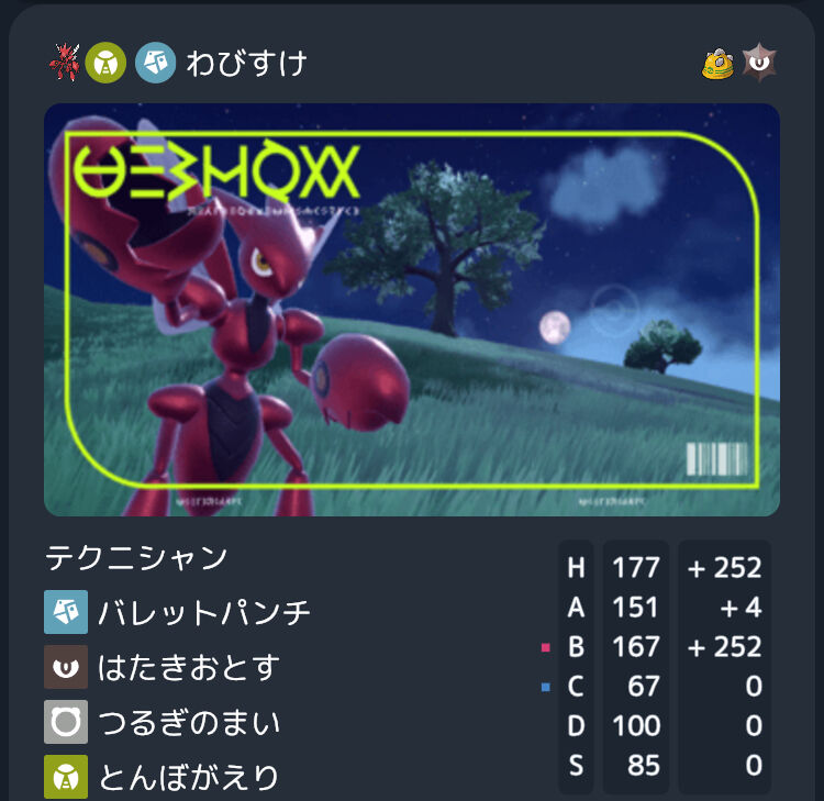 技構成は、原案ではパワーウィップが採用されていたが、じゃれは交換読みカイリューに、岩石はミラーにおいて必須なのでどちらも外せなかった。水ウーラオスをワンパンできないが、残った体力はハッサムのゴツメで無理やり削っていた。いつでも手榴弾として扱われる相棒。