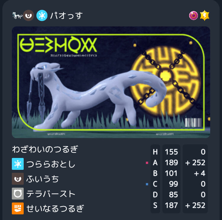 役割はゴツメでスカーフウーラオスをパオジアンの不意打ち圏内に入れることと、対面操作からパオジアン降臨を狙うこと。ランドロスの威嚇と合わせることで疑似的に耐久を上げ、2回程度のサイクルなら回せるようになる。対鉢巻き悪テラスパオジアンを最重要視し、HB特化。