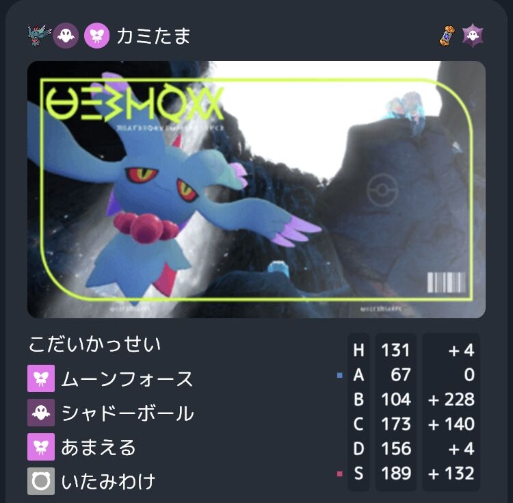 救世主。このポケモンに出会えていなければこの結果はあり得ないだろう。BIG6やアロキュウ&ツキに対して投げてく。対面性能があまりにも高く、まさに鬼だった。Aにほぼ振っていないのにテラスを切った時の火力がすさまじく、水ポンにはない強みがあった。