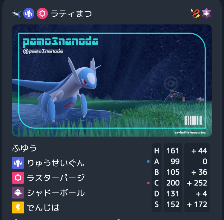 カイリューサーフゴーに安定して勝てるポケモンを考えていたところ、以前使っていた霊テラスサザンドラを思い出し、「ふゆう+霊テラ」で神速&地震カイリューを完封するラティオスを採用。副産物として、ラスターパージ+ゴテラシャドボで受けに来たH252サフゴやハバタクカミを処理できる。