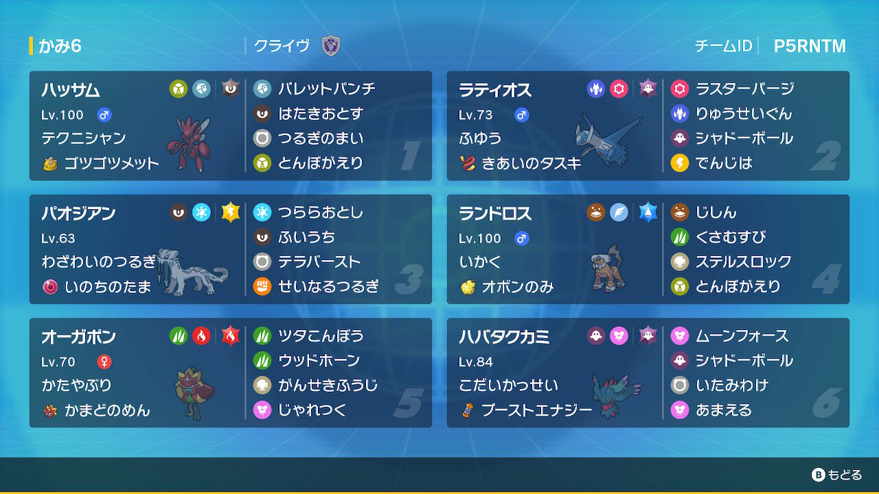 前期使用のこの4匹は、絶対に強い軸であるという信念でやってきたので、ここは貫き通す覚悟で構築を組みはじめました。ハバタクカミのテラスをステラからゴーストテラスにすることで、鋼タイプのポケモンを見ても積極的に選出できることに気づき、テラスタイプを変更しました。これによりカイリューハッサム構築への選出の理由付けもできました。