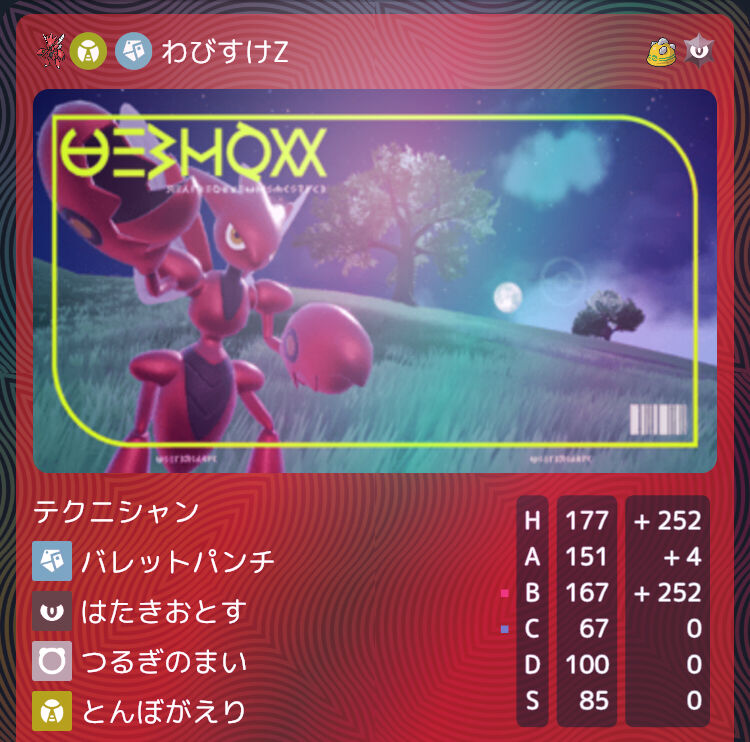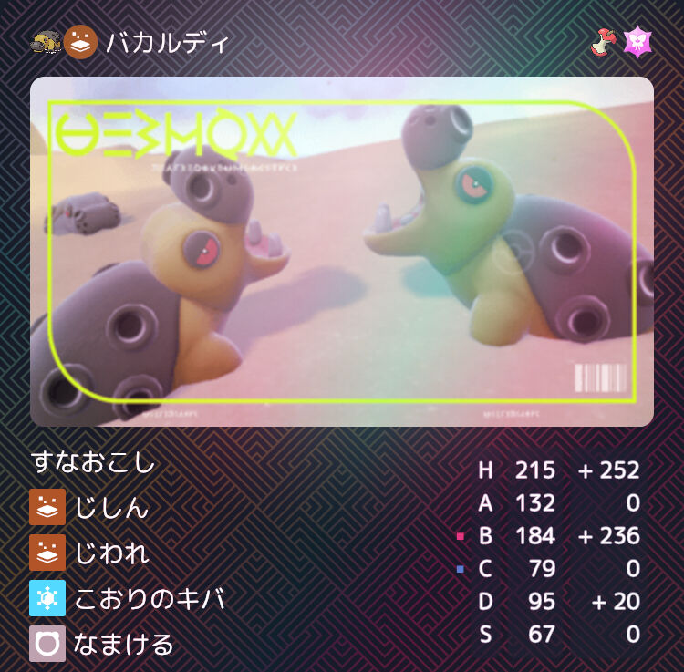 HBD0個体。伝説環境において対面最強の一般ポケモン。さらに、毒びし回収能力まで持ち合わせているので、スペック以上に立ち回りや選出の幅を広げてくれる、ガチ神ポケモン。