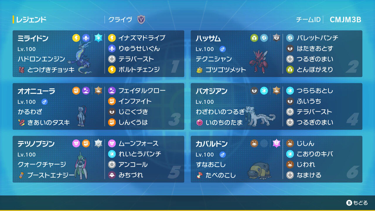 VS (黒バドスタン)・・・ミライドン+ハッサム+ニューラ (黒バド+ラオスランド)・・・ミライドン+ハッサム+ブジン (壁黒バド)・・・ミライドン+ニューラ+ブジン