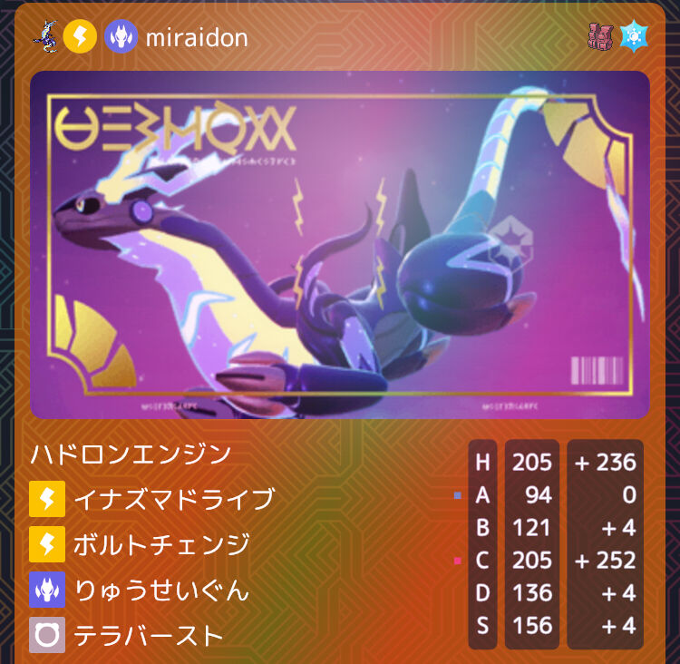 現環境において最も強いと考えている伝説ポケモン。チョッキミライドンは火力を削って耐久に回しているのをよく見るが、氷テラバでドオーを倒したりゴリランダーを大きく削ったりする必要があるので、火力は絶対に落とせない要素だと思っている。