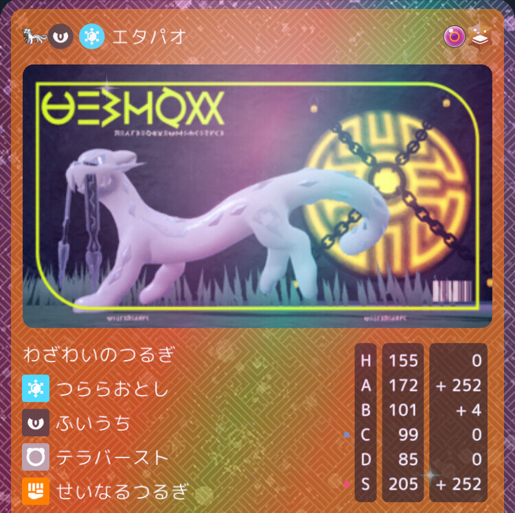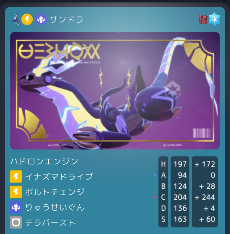 ノマテラカイリューへの最大打点、テラスを切らずにパオジアンに大ダメージを与えられる、回避率上昇を無視して攻撃できるetc...。受け崩しとしての能力を最大限に高めてくれた。