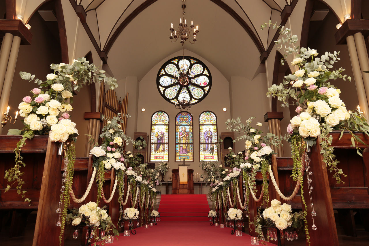 ガーデン内には英国国教会の正式な認定を受けた「聖ペテロ&パウロ教会」があり、ローズウィンドウ(バラ窓)をはじめ、聖人が描かれたメインのステンドグラス、パイプオルガンなど歴史ある英国の教会より譲り受けた品々がおかれ、英国の気品と伝統が漂います。