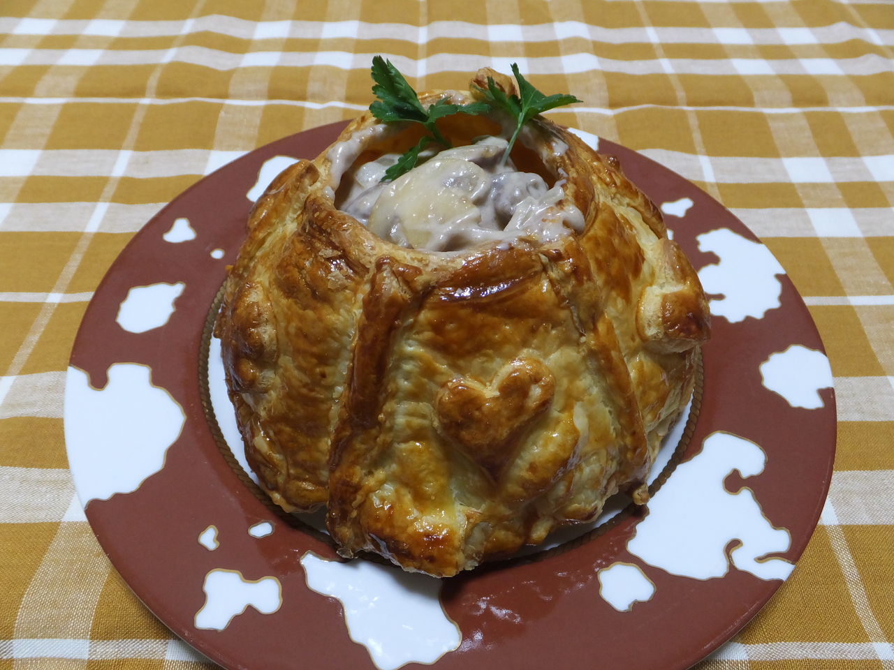 スイスの人気観光地、ルツェルンの郷土料理です。意味は「球状パイ」。半球ドーム状に焼き上げたパイ生地の中に、細切れにした仔牛肉や茸類のクリーム煮込みを詰めたものです。