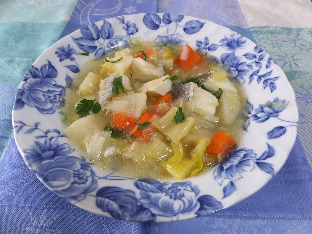 鍋にオリーブ油を熱してみじん切りニンニクを炒め、香りが出たら一口大に切ったリーキ(長葱で代用)・人参・ジャガイモを入れて火を通します。水を注いでしばらく煮込み、バカリャオ(甘塩鱈で代用)を加えて煮て、味を調えて出来上がりです。