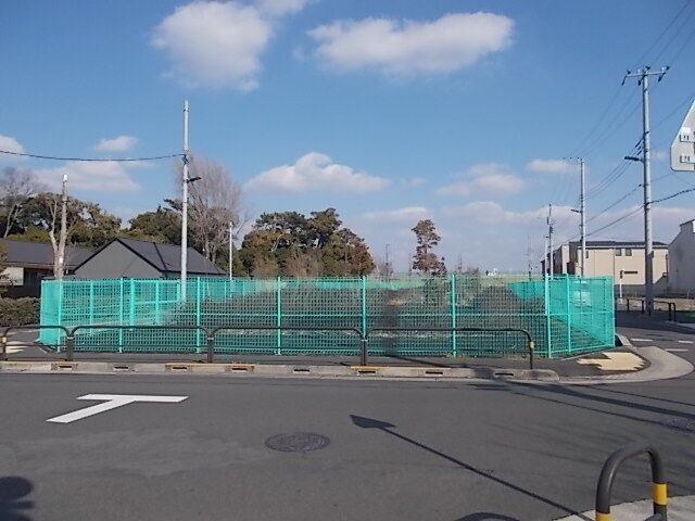 この狭い道の途中にある架空バスの停留所を設置するのにちょうど良さそうな場所は「funテニススクール」というテニスコートの前ですが、この向かいが緑のネットに覆われて工事中で、看板などを見たら新設される小学校であることが分かりました。
