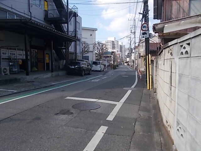 そして細い水路沿いの道(地図上では大正通りと書かれている)を歩いて潮止中学校の先を左折。左折した先(潮止中学校の北側)もしばらく道が狭いのですが。