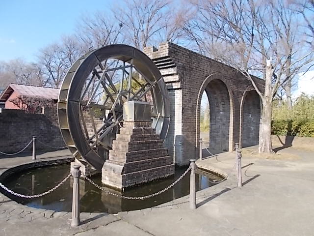 昔この場所に本当に水車小屋があったのかは不明ですが、煉瓦の水道橋っぽいものと水車のモニュメントがなかなかいい味を出しています。
