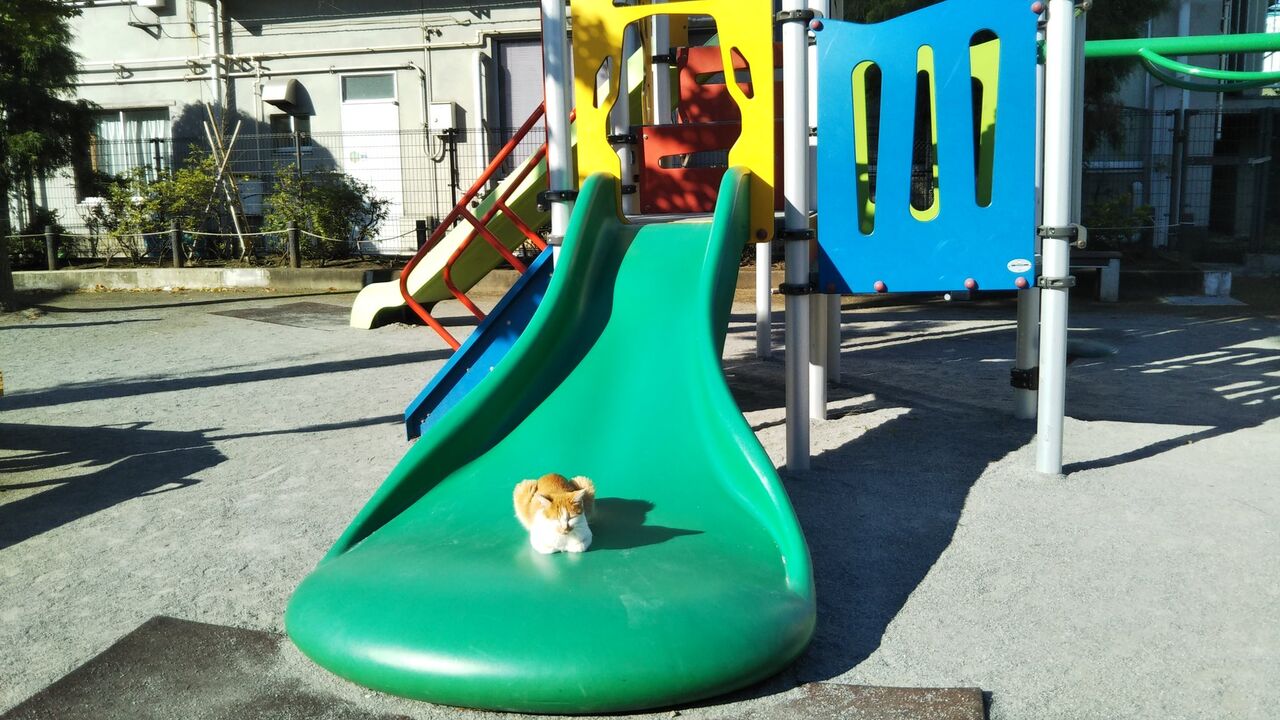 もちろん猫が滑り台で遊んでいる訳ではなく、10月も今日で終わりということもあって外が寒くなってきた中、ここが日なたということで滑り台が暖かいためだと思われます。