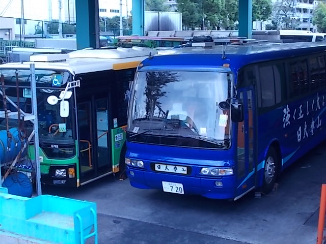 また、このバスの隣には日大豊山中学・高校のバスが置いてあり、パッと見あまり古さは感じないもののナンバーの数字から20年以上大切に使っている古い車両だと分かりました。そして観光バスタイプのエアロバスながら前扉が折戸で、特別珍しいという程ではないけどこういう仕様は少数派です。