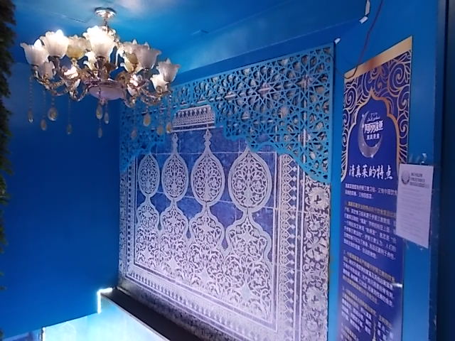 エントランスは水色の壁に中東や中央アジアのような異国情緒溢れるデザインの装飾が施されているほか、店頭の案内は中国語しか書かれていなく、一体ここはどこなのだろうという錯覚に陥りますね。